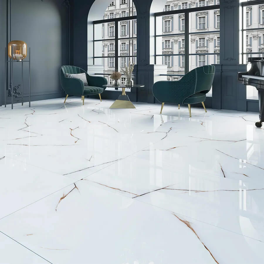- Современный формат 60×120 см: позволяет укладывать плитку с минимальным количеством швов, что создает эффект монолитной мраморной поверхности.