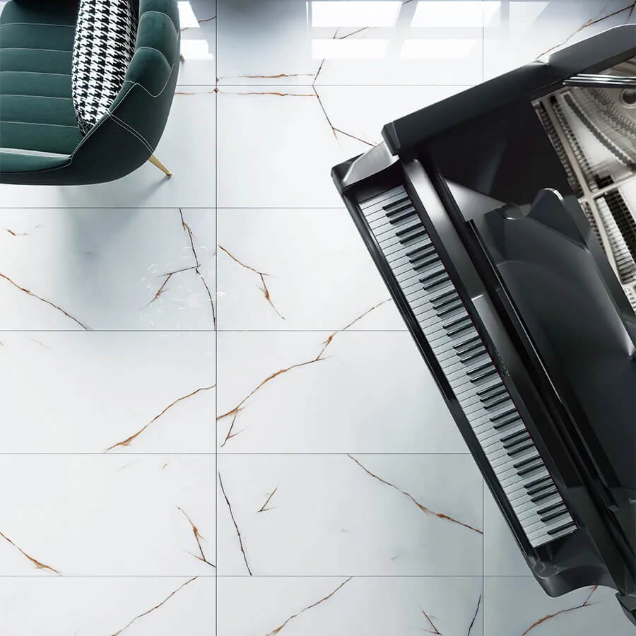 - Имитация натурального мрамора: утонченные прожилки придают плитке благородный вид без излишков в уходе, характерных для природного камня.