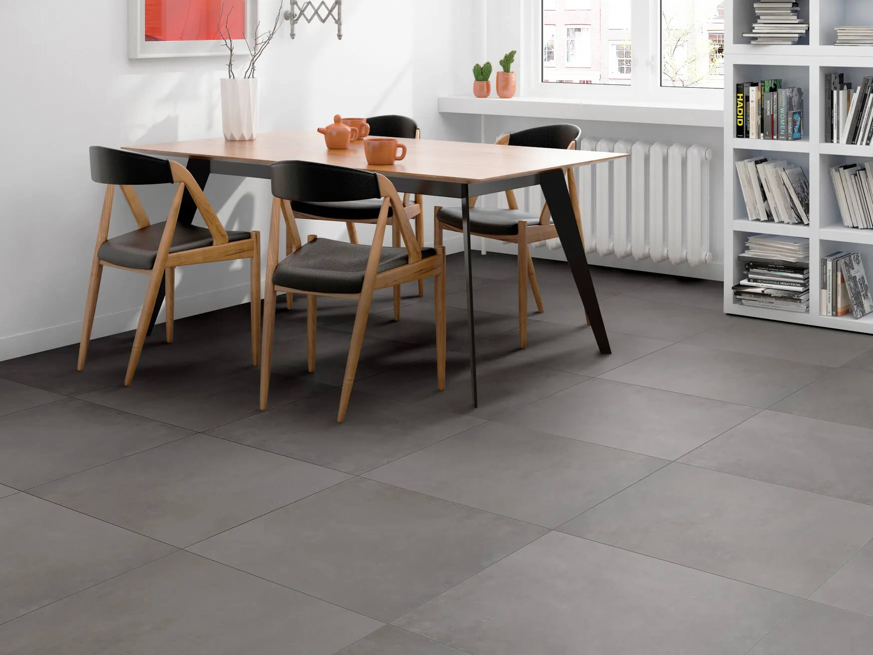 Серый матовый оттенок с фактурой под бетон хорошо сочетается с современными интерьерами и легко комбинируется с разной мебелью и отделочными материалами. Формат 598х598 мм помогает создать ровное и визуально цельное покрытие.