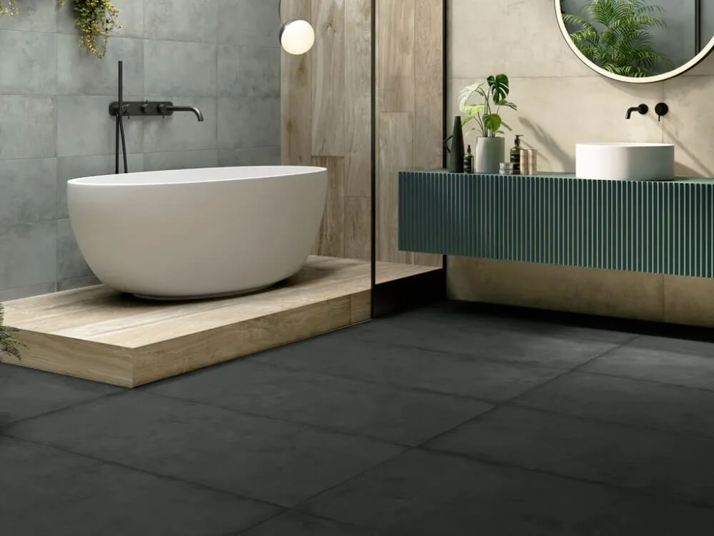 Керамогранит напольный Cersanit Colin Anthracite 598 х 1198 мм — это стильное и практичное решение для современных интерьеров. Его насыщенный антрацитовый цвет с текстурой под бетон создаёт эффект минималистичной индустриальной эстетики, придавая помещению глубину и характер. Поверхность — матовая, не бликует, легко очищается и не скользит, что особенно важно для ванных комнат и кухонь.