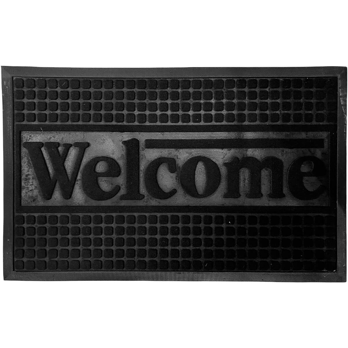 Черный прямоугольный придверный коврик размером 50×80 см выполнен из прочной резины, что обеспечивает надежную защиту от грязи и влаги. Стильная надпись «Welcome» добавляет коврику привлекательности и создает уютную атмосферу для гостей.