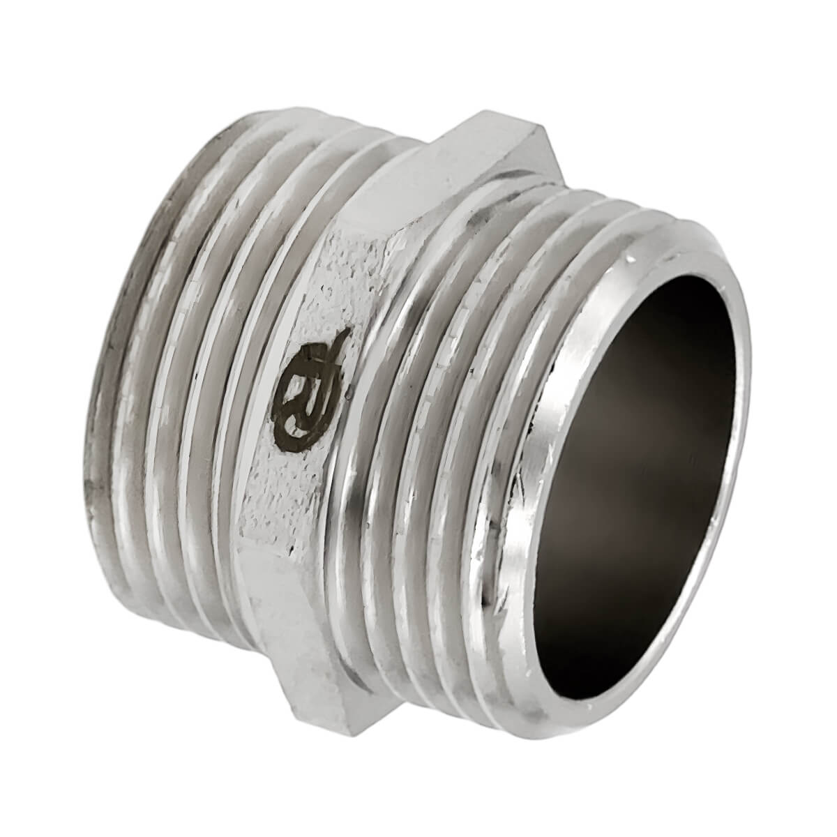 Ниппель изготовлен из высококачественной никелированной латуни, что обеспечивает долговечность и устойчивость к коррозии. Оснащен наружной резьбой с обеих сторон диаметром 1", что позволяет легко подключать элементы системы водоснабжения или отопления.