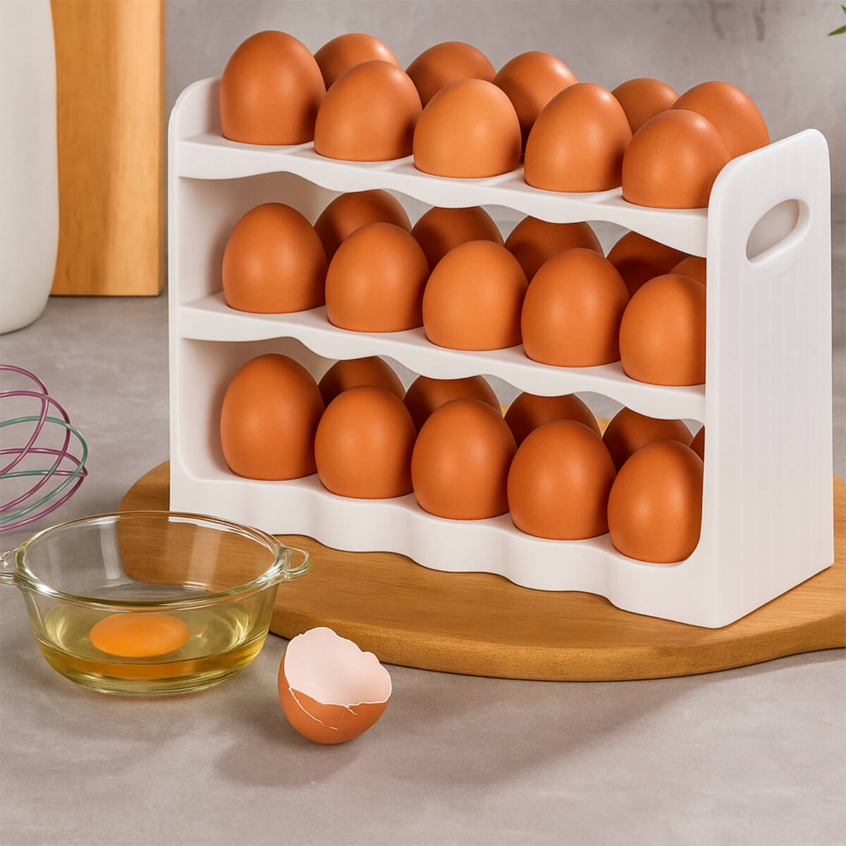 Предназначен для компактного и упорядоченного хранения 30 куриных яиц в холодильнике или на полке. Помогает защитить яйца от повреждений и сэкономить место.