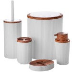 Комплект из 5 аксессуаров для ванной комнаты с деревянными вставками, выполненный в минималистичном стиле.