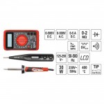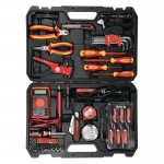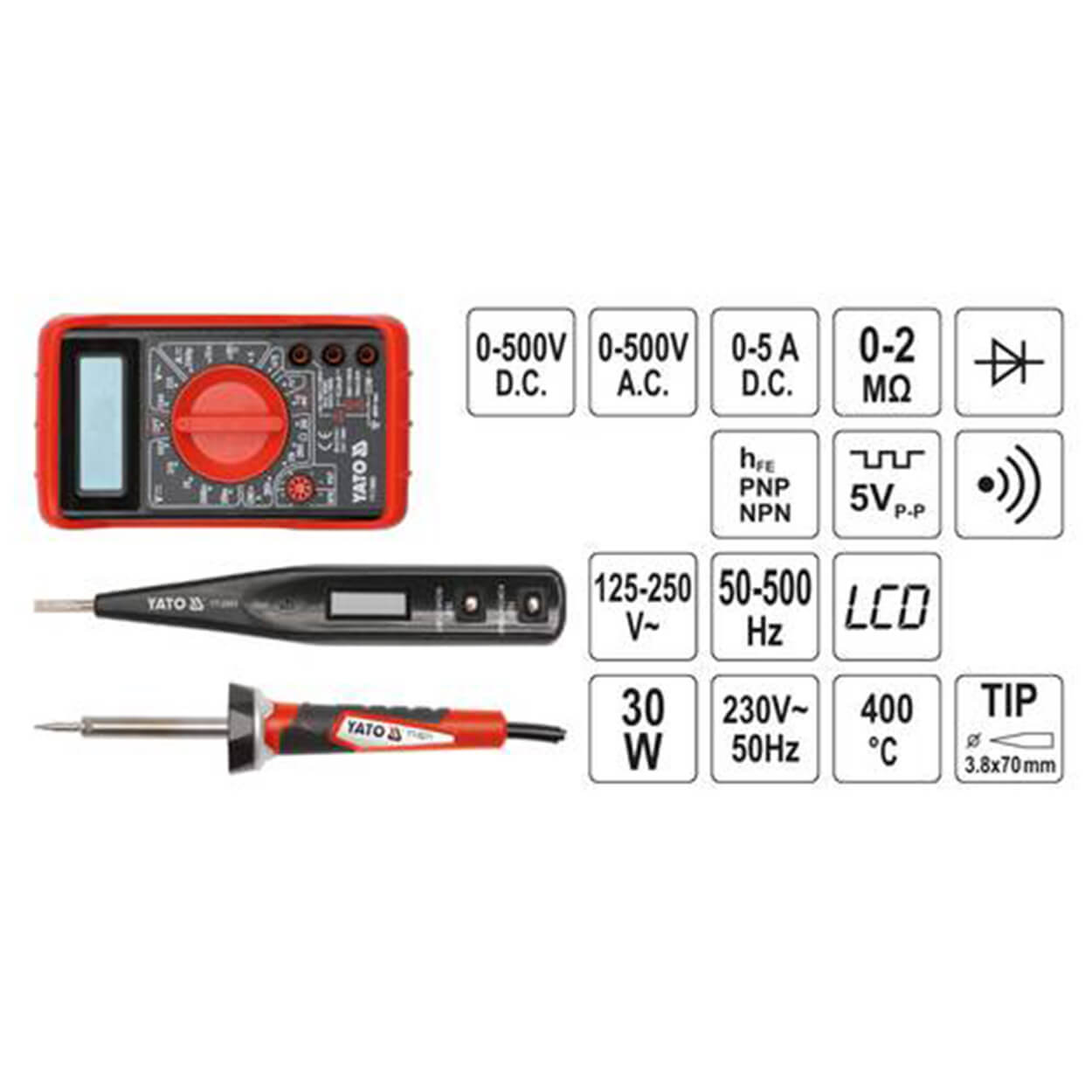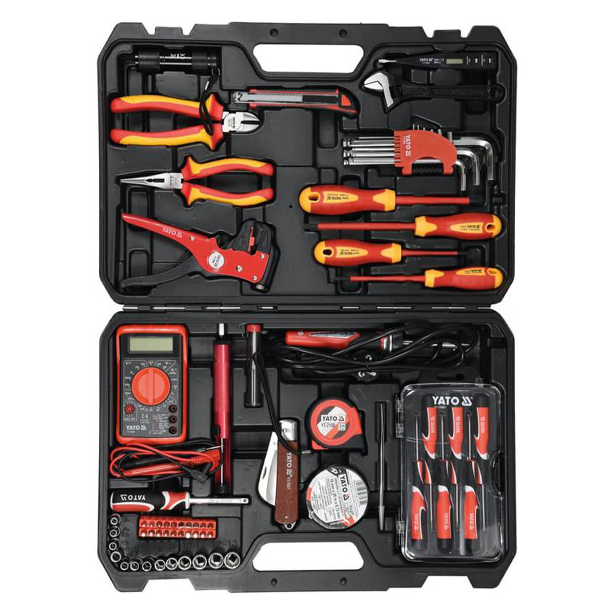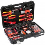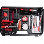 Мультиметр цифровой 500В; Тестер напряжения цифровой 12-250V с дисплеем; Электропаяльник стержневой 60В; Клещи-автомат для снятия изоляции 0,5-6 мм 175 мм; Шприц для удаления припоя; Ключ разводной цельный 19х150 мм (черный); Бокорезы 160 мм (до 1000В); Утконосы 160 мм (до 1000В); Отвертки плоские (до 1000В): 4х75, 5.5х125; Отвертки крестовые диэлектрические (до 1000В): РН1х80, РН2х100; Набор точных часовых отверток: 1,4х50, 2х50, 2,4х50, РН00х50, РН0х50, РН1х50; Ключи шестигранные от 1,5 до 10 мм; Нож складной 190 мм; Нож с отломным лезвием 9 мм; Пинцет антимагнитный кислотостойкий прямой 140 мм HRC 30; Рулетка 3 м х 19 мм (стальная лента с нейлоновым покрытием с миллиметровой шкалой); Фонарик алюминиевый 9 LED; Изолента 19 мм х 20 м черная; Головки 1/4’’: плоские 3, 4, 5.5, 6 мм; РН1, РН2, РН3; Т8, Т10, Т15, Т20, Т25, Т27; 6-гранные 2, 2.5, 3, 4, 5, 6 мм Кейс