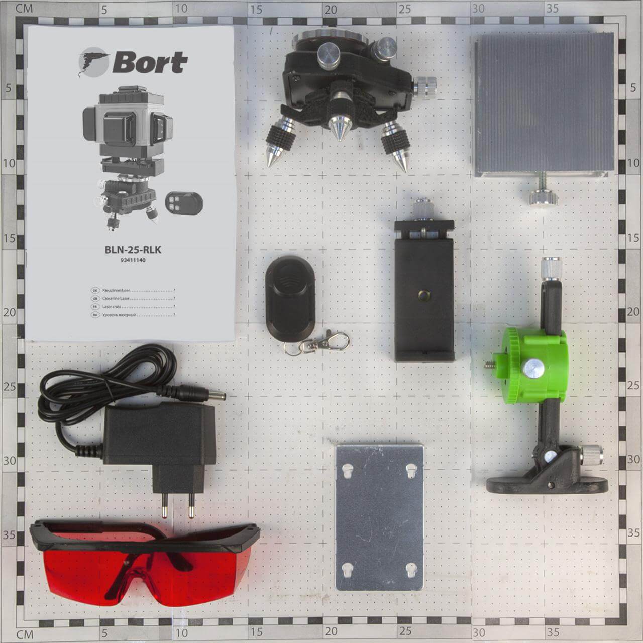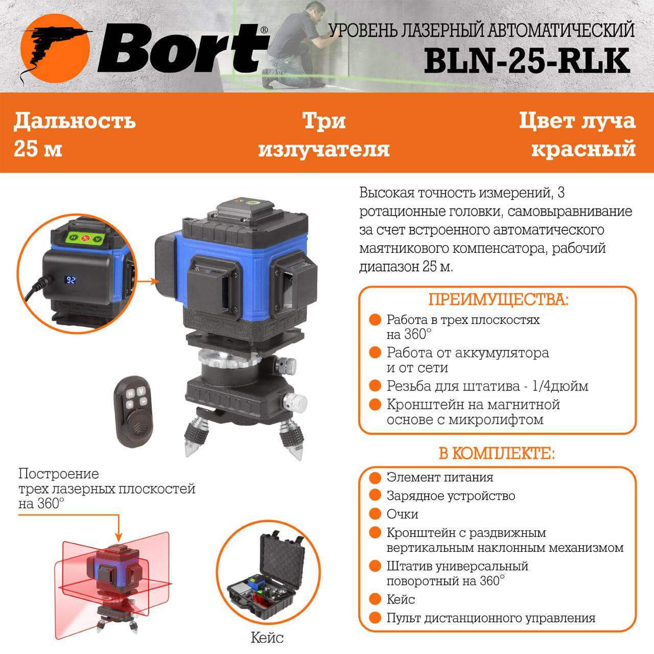 Лазерные уровни Bort, благодаря высокой точности измерений и функциональности, давно известны в строительной среде и завоевали репутацию надежной и качественной измерительной техники по доступной цене. В ассортиментной линейке представлено несколько моделей. Одна из них – уровень лазерный автоматический BLN-25-RLK. Она имеет схожие с BLN-25-GLK технические характеристики. Отличия касаются лишь цвета луча (в BLN-25-RLK он красный, 635 Нм, в то время как в BLN-25-GLK – зеленый), а также комплектации. Считается, что зеленый луч лучше виден, особенно на большом расстоянии, но некоторым пользователям привычнее и комфортнее работать с красным цветом. В BLN-25-RLK очки не с зелеными, а с красными стеклами, поставляется пульт ДУ (в модели BLN-25-GLK его нет). Все остальное без изменений: универсальный поворотный штатив на 360, кронштейн с раздвижным вертикальным наклонным механизмом, литий-ионная батарея и зарядное устройство. Технические характеристики модели достаточно высокие и позволяют проводить ремонтные и строительные работы не только в помещении, но и на открытых ландшафтах.