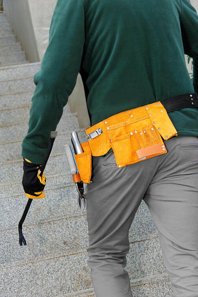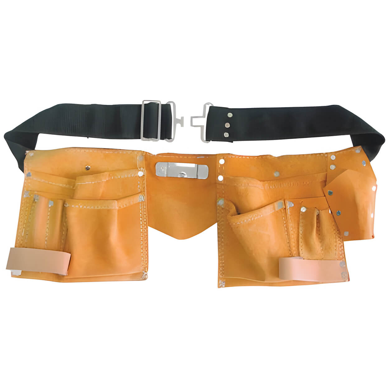 Два больших и два маленьких кармана для гвоздей, 6 карманов для инструментов, 2 держателя для молотка, держатель для рулетки.