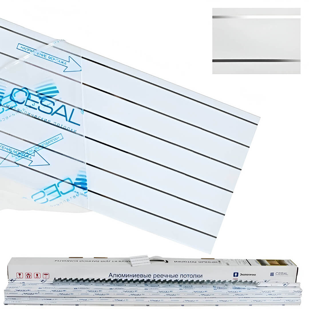Универсальный реечный потолок Cesal B19 размером 3х0,15 м (0,45 м2) в жемчужно-белом цвете с металлической полосой. Идеально подходит для закрытия потолочного пространства в различных помещениях, включая ванные комнаты, кухни, балконы и общественные помещения.