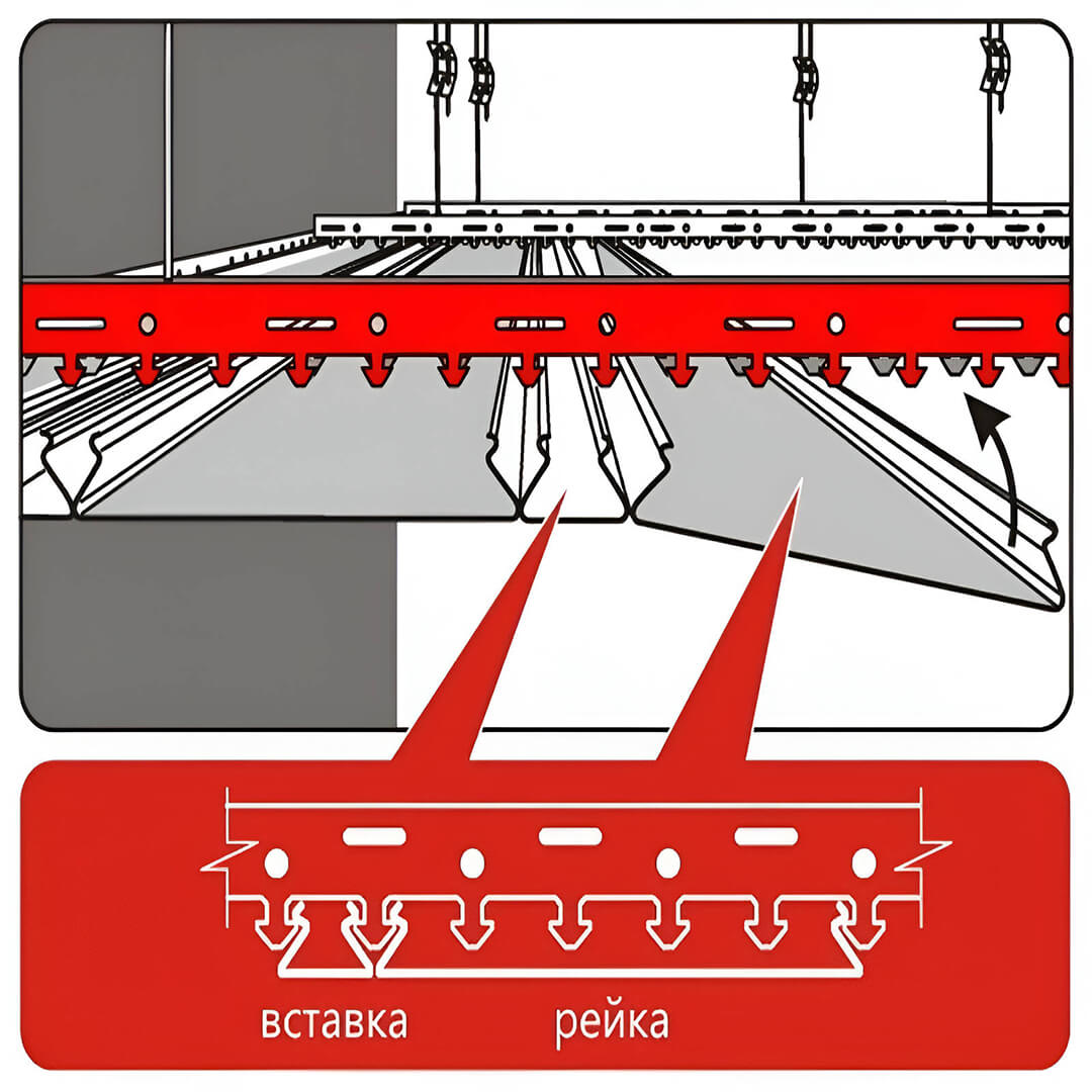 Стрингер гребенка Cesal длиной 4 метра из оцинкованной стали. Используется в качестве несущего профиля для установки реек Cesal S-100 и S-150. Может быть подвешен на подвесы для регулировки уровня или установлен непосредственно к потолку.