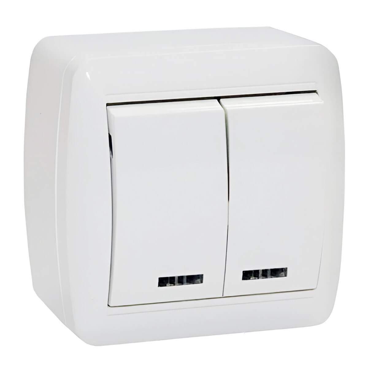 Выключатель накладной двухклавишный ELMOS с индикатором, белый, 10 А, 230 В, IP44 (арт. 8001-02N)