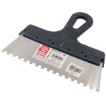 Легкий и удобный зубчатый шпатель Bau Welt 200мм с пластиковой рукояткой 6х6 мм, из нержавеющей стали, подходит для выравнивания штукатурки и плиточного клея.