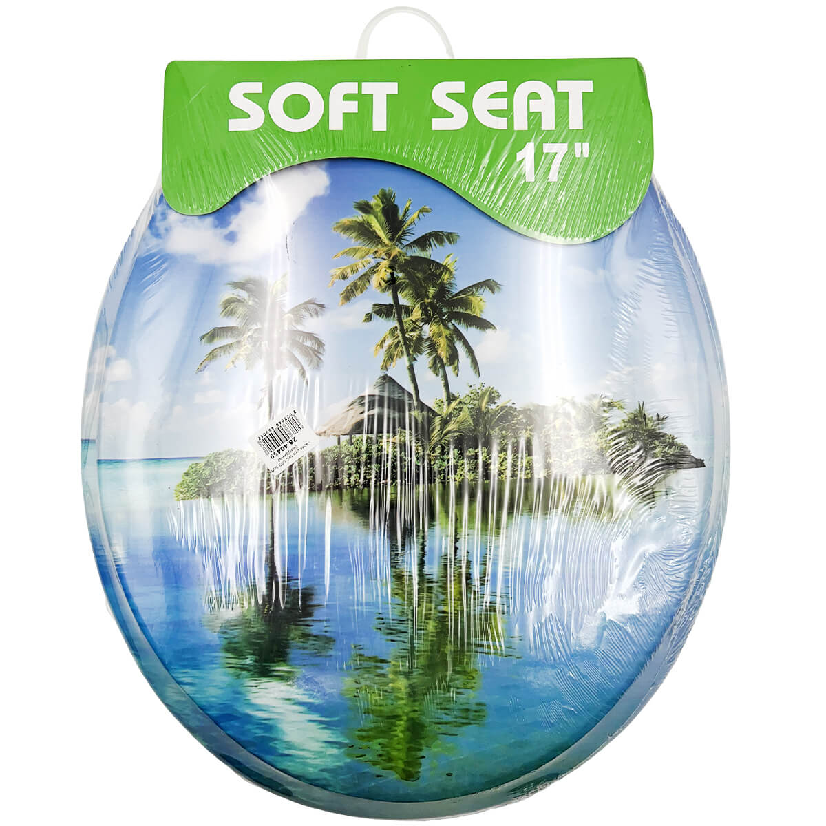Мягкое сиденье для унитаза с ярким рисунком тропического острова создаст уют в ванной комнате. Изготовлено из пластика с мягким покрытием для комфортного использования. Легко устанавливается на стандартные унитазы и просто очищается от загрязнений.