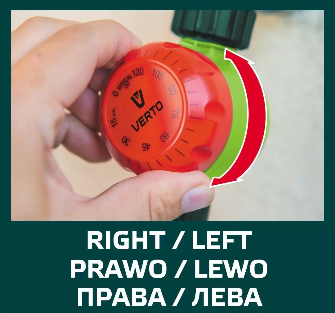 Таймер устанавливается непосредственно на кран с резьбой 3/4" или 1", не требует подключения к электросети и работает полностью на механической основе. Установка времени осуществляется поворотом диска с делениями до 120 минут, что позволяет точно контролировать продолжительность полива.