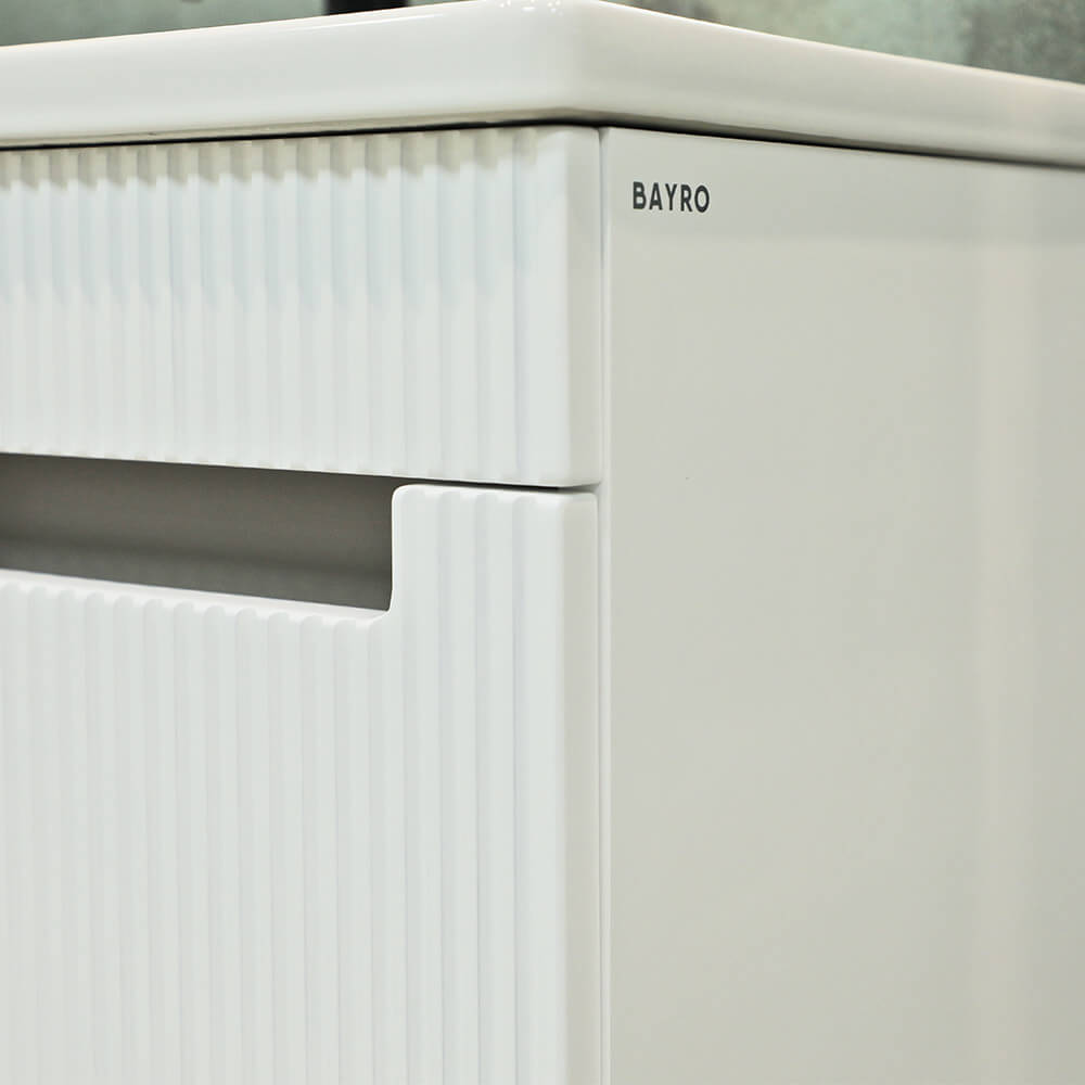 Шкаф под умывальник BAYRO Positano 602х460х820 мм — стильное и практичное решение для современной ванной комнаты. Модель выполнена в минималистичном дизайне с матовым белым фасадом и рифленой текстурой, которая придаёт изделию характер и глубину.