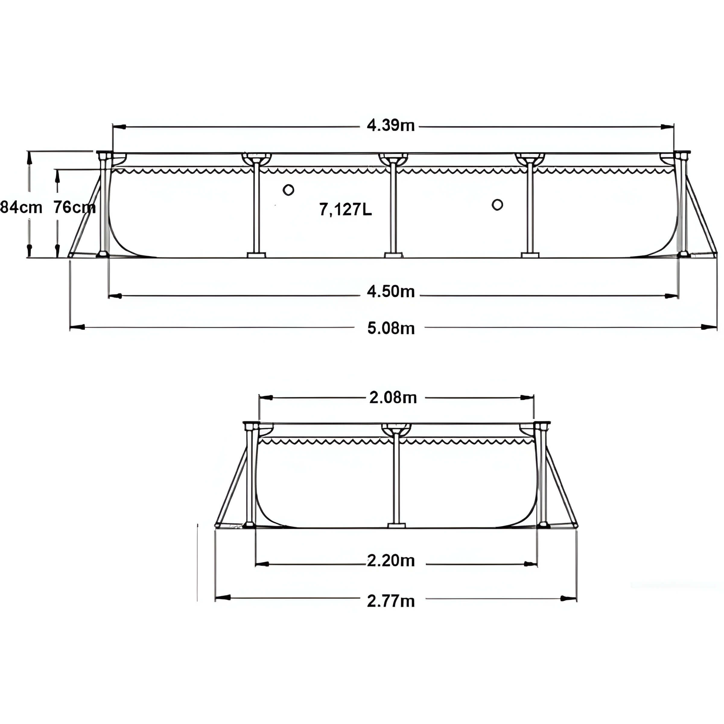 Piscina are o formă dreptunghiulară și este dotată cu un cadru metalic solid din țevi galvanizate. Această construcție oferă stabilitate și suportă sarcini mari în timpul utilizării active.