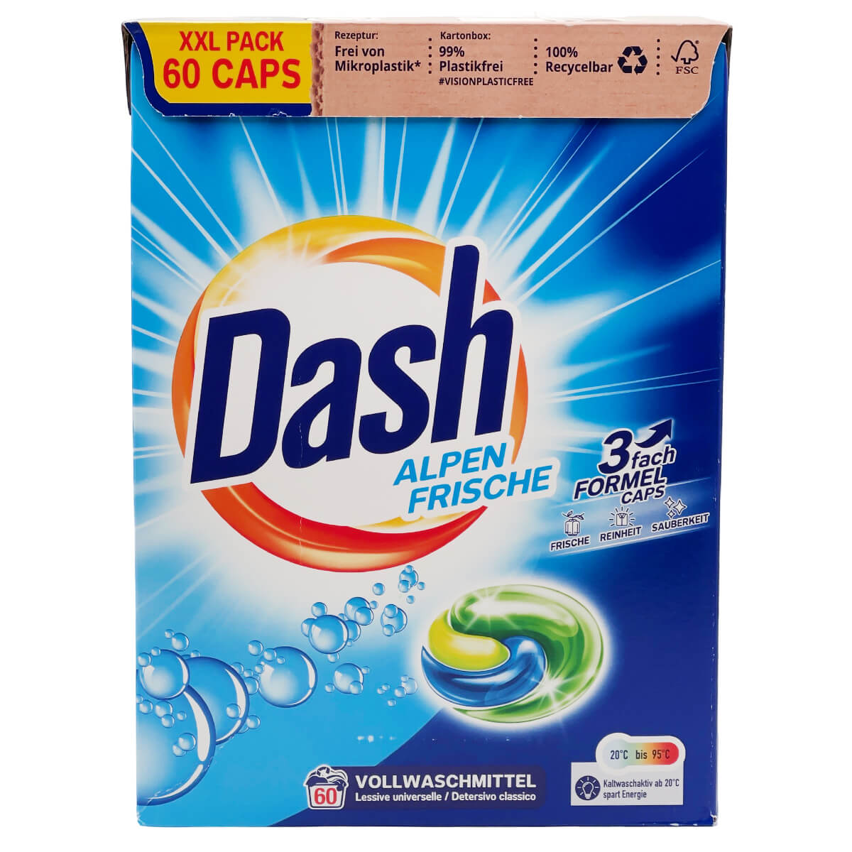 Capsule detergent pentru spălat rufe Dash Alpen Frische 3 în 1, 60 capsule (60 spălări), 1,494 kg — un detergent concentrat sub formă de capsule, conceput pentru spălarea zilnică atunci când este necesar un rezultat constant, fără pahare de dozare și fără praf de detergent. Capsula se dizolvă complet în apă și ajută simultan la curățare, împrospătare și menținerea unui aspect îngrijit al hainelor după spălare.