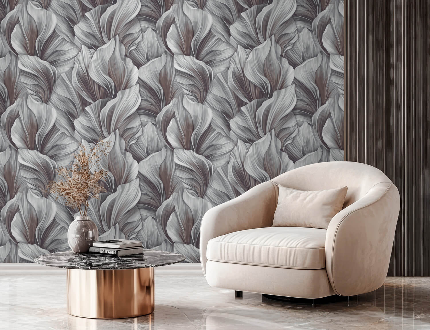 Tapet vinilic pe bază de flizelină Wallsecret Comfort Mia 9154-26 — o soluție practică pentru un interior modern. Relieful obținut prin embosare la cald adaugă profunzime, iar desenul vegetal de dimensiuni mari, în nuanțe echilibrate de gri-bej, evidențiază peretele fără a încărca vizual încăperea.