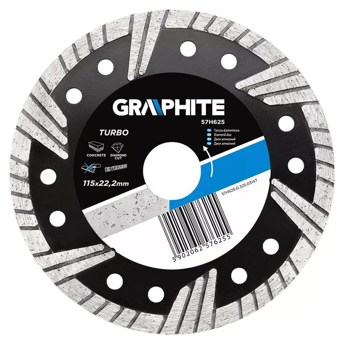 Disc diamantat Graphite TURBO pentru beton 115 x 22,2 x 2,4 mm, segment 6 mm, pentru polizor unghiular 57H625 este destinat tăierii betonului și a altor materiale minerale cu ajutorul polizorului unghiular. Geometria de tip turbo a muchiei active permite o pătrundere mai rapidă în material și asigură o linie de tăiere mai uniformă.