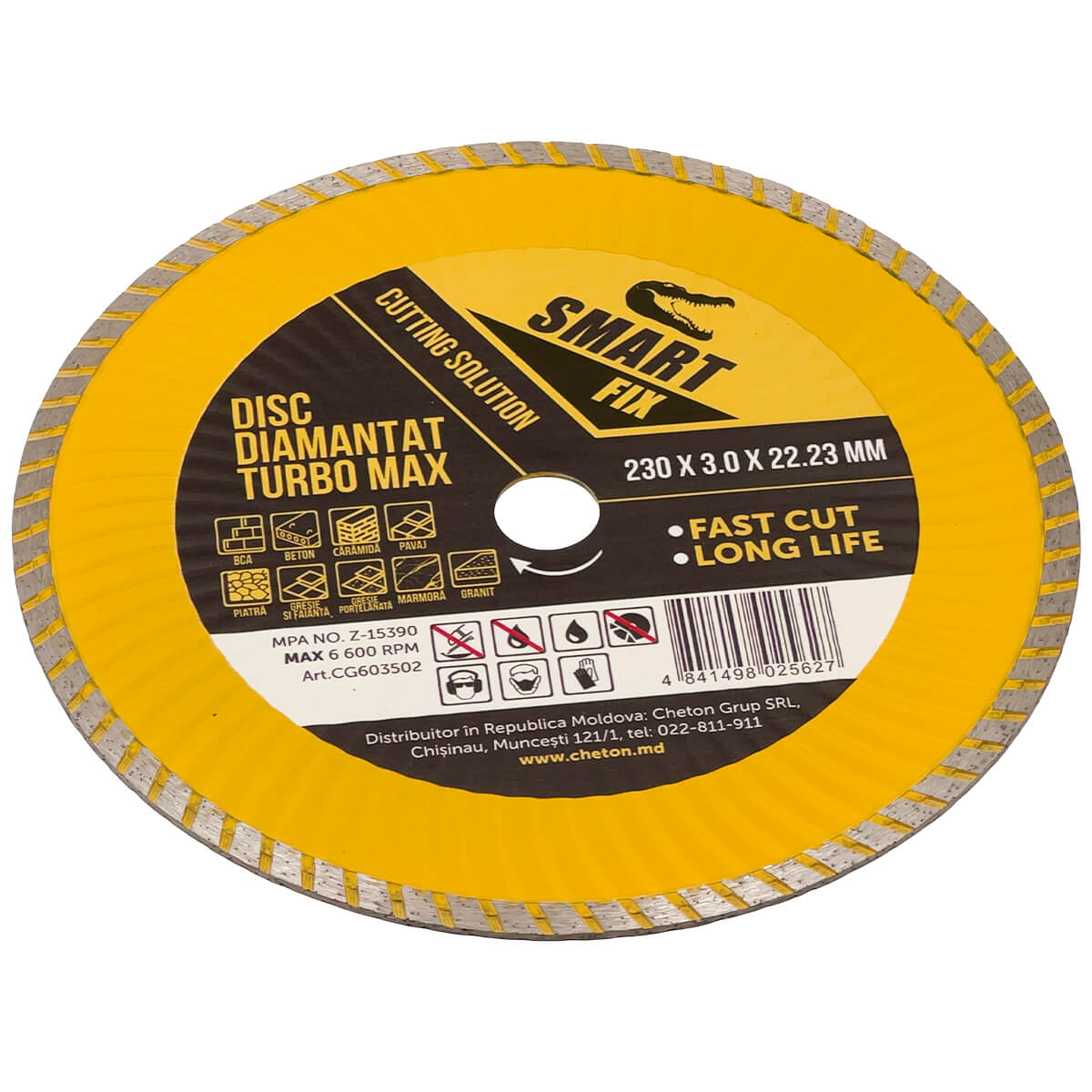 Discul diamantat de tăiere Smart Fix Turbo Max, universal este conceput pentru efectuarea tăieturilor precise și stabile pe o gamă largă de materiale din construcții. Structura de tip turbo oferă viteză ridicată de lucru și o linie curată de tăiere chiar și în condiții de sarcină intensă. Stratului diamantat întărit îi revine rolul de a reduce uzura și de a asigura un rezultat constant atât în tăierea uscată, cât și în cea umedă.