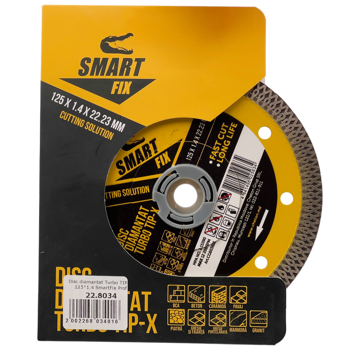 Discul diamantat de tăiere Smart Fix Turbo Tip-X reprezintă o soluție universală pentru tăieri precise și stabile pe o gamă largă de materiale de construcții. Structura cu segment turbo oferă viteză ridicată de lucru și rezistență la uzură în condiții de utilizare intensă, fiind potrivit atât pentru aplicații profesionale, cât și pentru cele casnice.