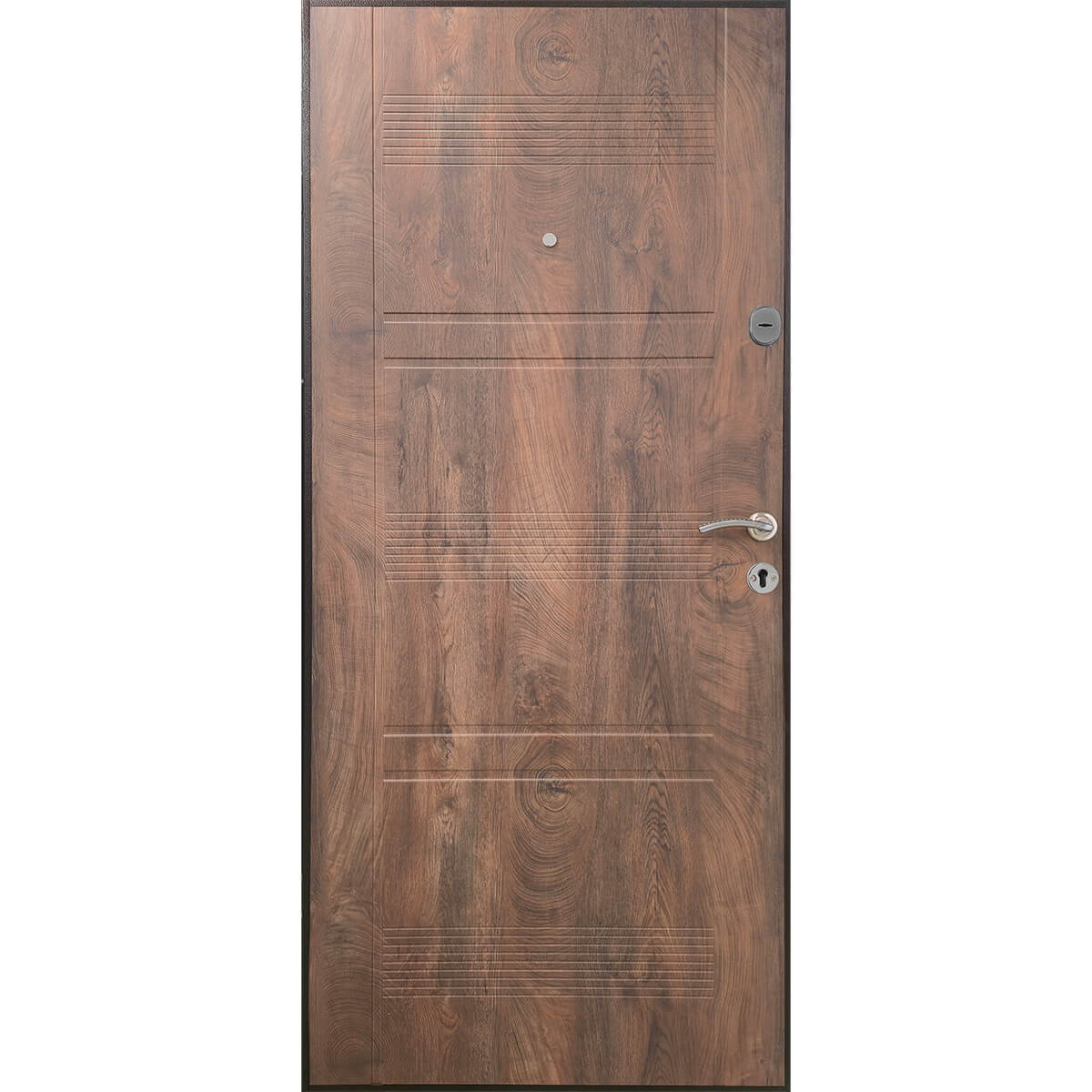 Ușa de intrare din metal PU132, deschidere pe dreapta, culoare cupru, 2050x860x120 mm este o soluție practică pentru accesul într-o casă individuală. Foaia metalică asigură un nivel de bază de protecție și stabilitate a construcției, iar finisajul decorativ în nuanță de cupru, cu aspect de lemn pe partea interioară, oferă un design ordonat și ușor de integrat în majoritatea interioarelor.