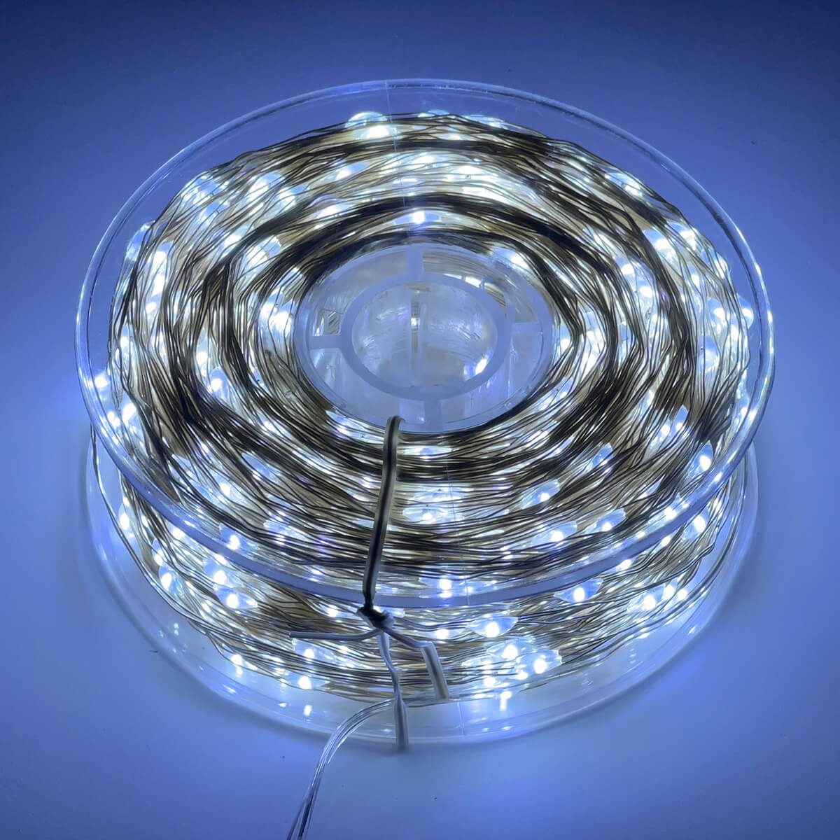 Ghirlandă LED 100 m, 1000 LED-uri, de tip fir, alb rece — iluminare decorativă lungă pentru amenajarea zonelor mari: brad, fațadă, vitrine, balustrade, arcade, fotocolțuri și interior. Lumina alb rece oferă un efect curat, «înghețat», și evidențiază contururile.