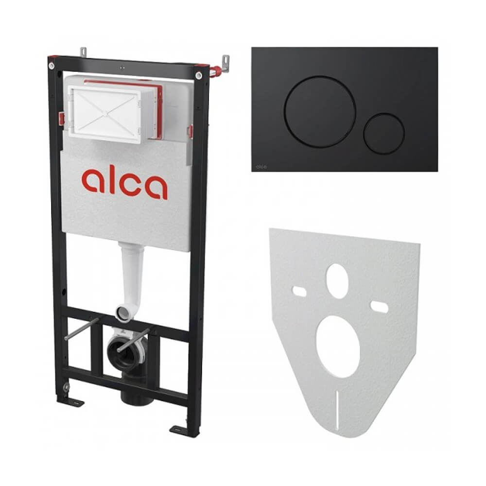 Instalație WC încastrată 3 în 1 Alcaplast AM101/1120 Sadromodul — o soluție modernă pentru montaj ascuns, ce combină o construcție solidă, un mecanism de spălare fiabil și elemente suplimentare practice. Pachetul include butonul elegant negru mat M678, precum și izolarea fonică M91, care asigură un confort sporit în utilizare.