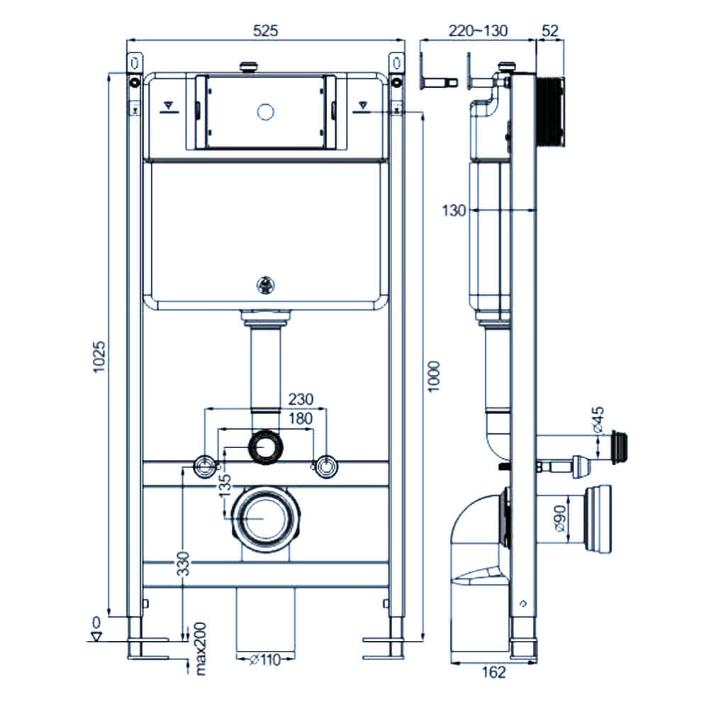 Cadrul este realizat din metal rezistent, conceput pentru sarcini mari, iar rezervorul este fabricat din plastic de calitate, cu protecție împotriva condensului. Datorită tijelor reglabile de 180 și 230 mm, instalația este compatibilă cu majoritatea modelelor de vase WC suspendate.