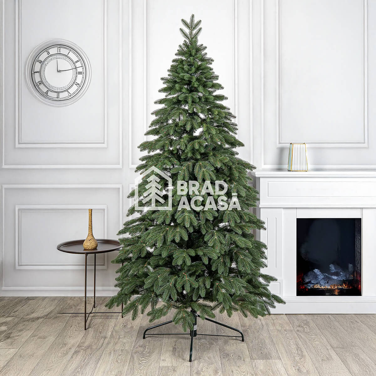 Culoarea verde a acelor are un aspect natural și se potrivește ușor cu orice tip de decor de sărbători — de la combinații clasice roșu-auriu până la soluții minimaliste monocrome. Materialul bradului este ignifug, ceea ce sporește siguranța la utilizarea ghirlandelor electrice.