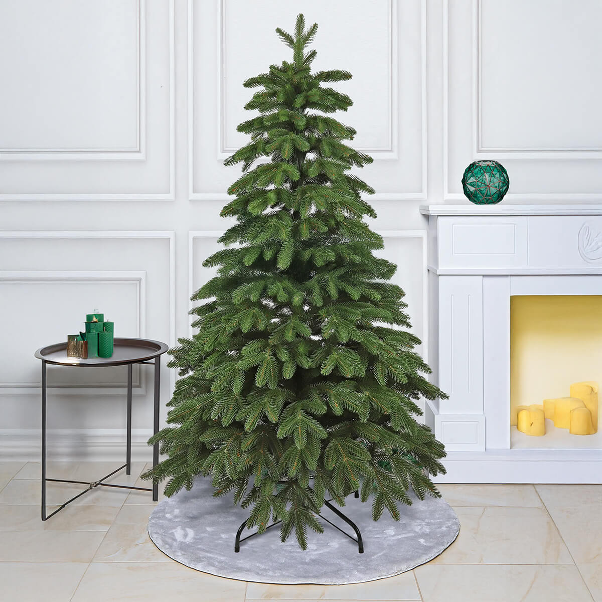 Asamblarea este gândită pentru montaj sezonier rapid: elementele se îmbină succesiv, ramurile se desfac manual până la densitatea dorită, iar suportul metalic pliabil asigură stabilitate pe podea. Ramurile sunt fixate solid, astfel încât, în utilizare normală, nu se lasă și își păstrează forma pe toată durata sărbătorilor.
