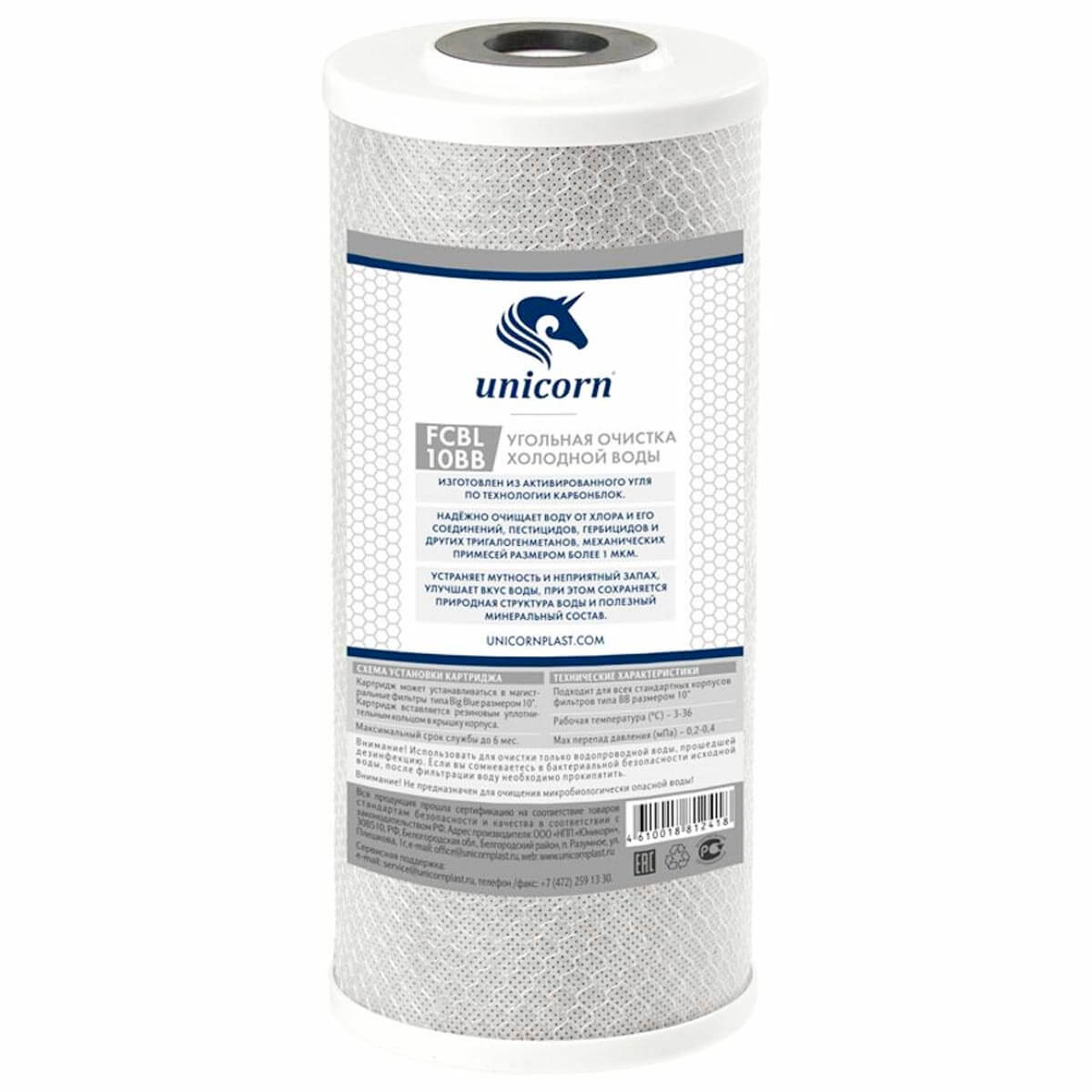 Cartuș pentru filtru UNICORN pentru apă rece din cărbune presat 5'' FCBLO5SL - Folosit pentru purificarea apei, îmbunătățește proprietățile organoleptice ale apei.