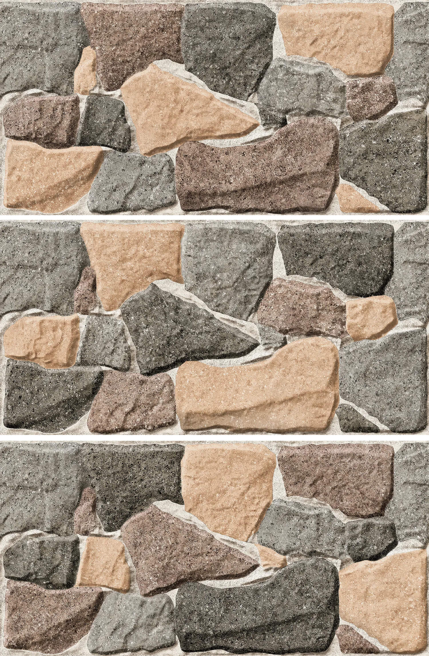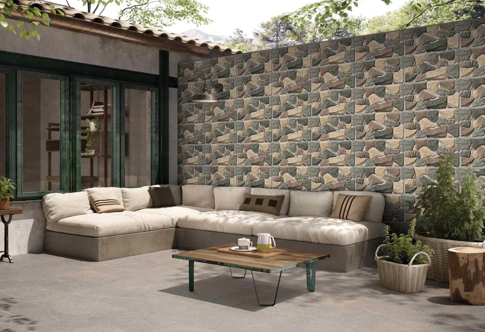 Modelul cu aspect de zidărie din piatră este potrivit pentru pereți accent și zone unde este nevoie de textură, fără a încărca vizual spațiul. Nuanțele maro-gri-bej se combină ușor cu lemnul, betonul, obiectele sanitare albe sau în tonuri calde, precum și cu feroneria neagră sau din alamă.