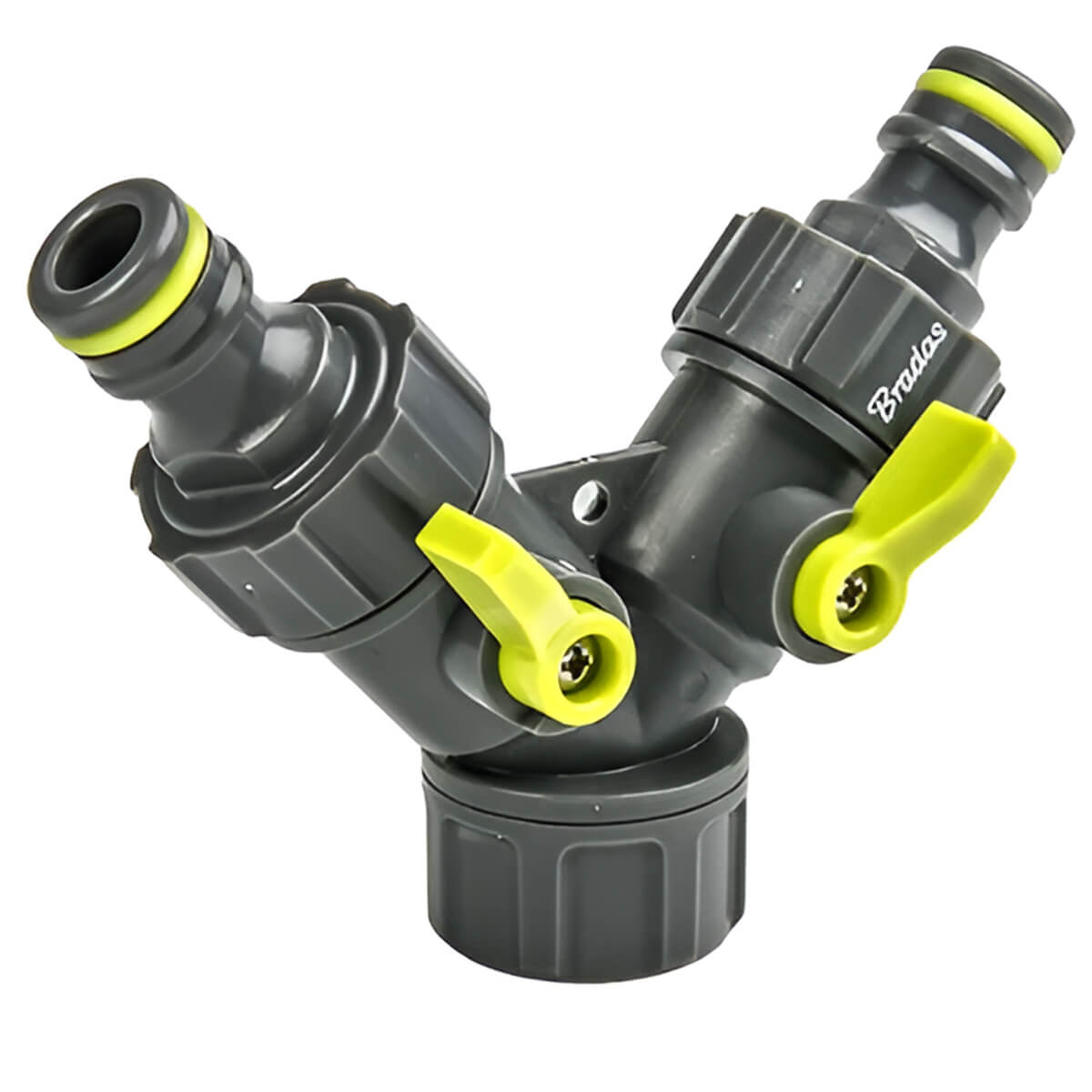 Distribuitorul de apă pentru irigare Bradas LIME LINE LE-02220K, 3/4", 2 căi, cu robinete este un adaptor practic care împarte o singură sursă de apă în două ieșiri independente. Este potrivit atunci când trebuie conectate simultan două furtunuri sau două linii de udare, de exemplu pentru gazon și pentru irigare prin picurare, cu posibilitatea de a regla separat debitul pe fiecare linie.
