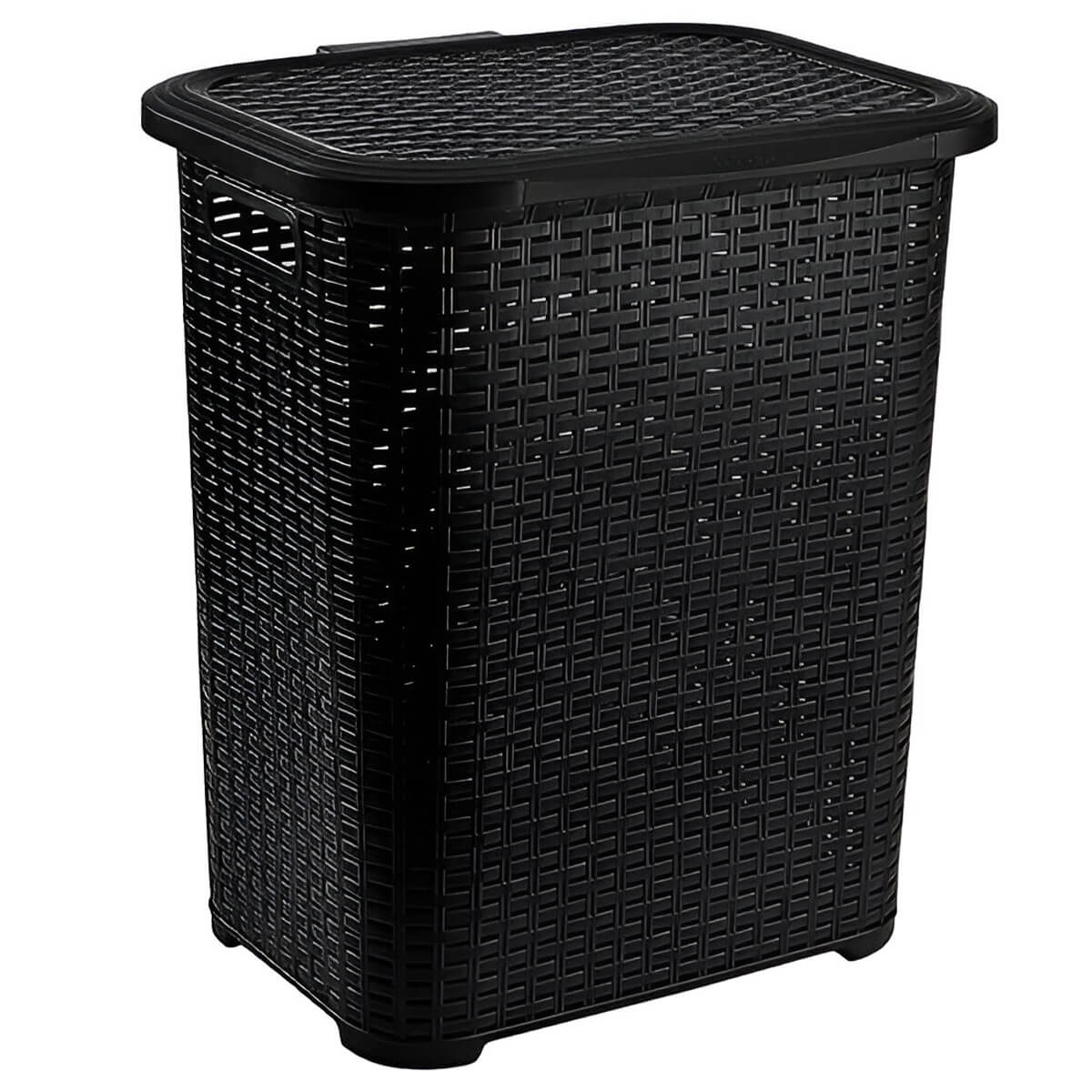 Volumul de 63 L permite strângerea rufelor pentru mai multe spălări, iar capacul ajută la ascunderea conținutului și menținerea ordinii. Plasticul (polipropilenă) este rezistent la umiditate și ușor de curățat, iar textura împletită tip „ratan” are un aspect îngrijit și se potrivește cu majoritatea interioarelor.