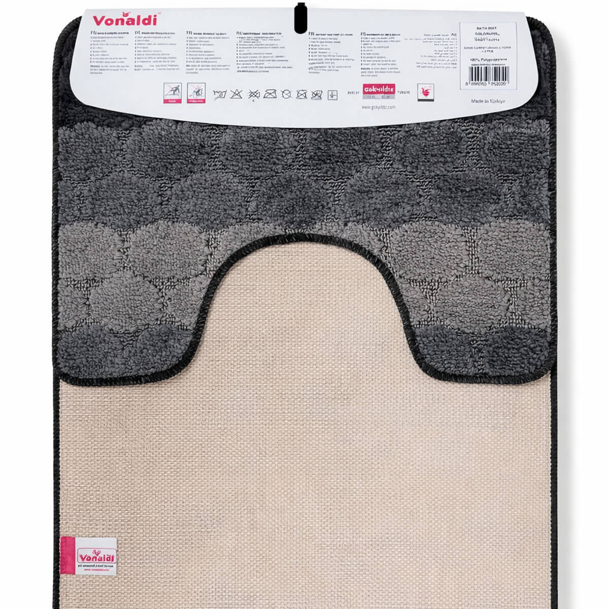 Set practic format din două covorașe, conceput pentru confort zilnic în baie. Un covoraș este destinat zonei de lângă cadă sau duș, iar al doilea este potrivit pentru toaletă. Seria Vonaldi Colorline este realizată în nuanțe calme de gri-grafit, ușor de integrat în combinație cu gresia și obiectele sanitare.