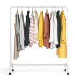 Suport pentru haine de podea pe roți 110×41×150 cm, metalic, alb, 1 bară RKJ112W — o soluție practică pentru depozitarea și uscarea hainelor acasă, în magazin, la birou, în dressing sau pe balcon. Datorită roților, suportul se deplasează ușor, iar bara largă permite agățarea umerașelor cu haine groase, cămăși și rochii.