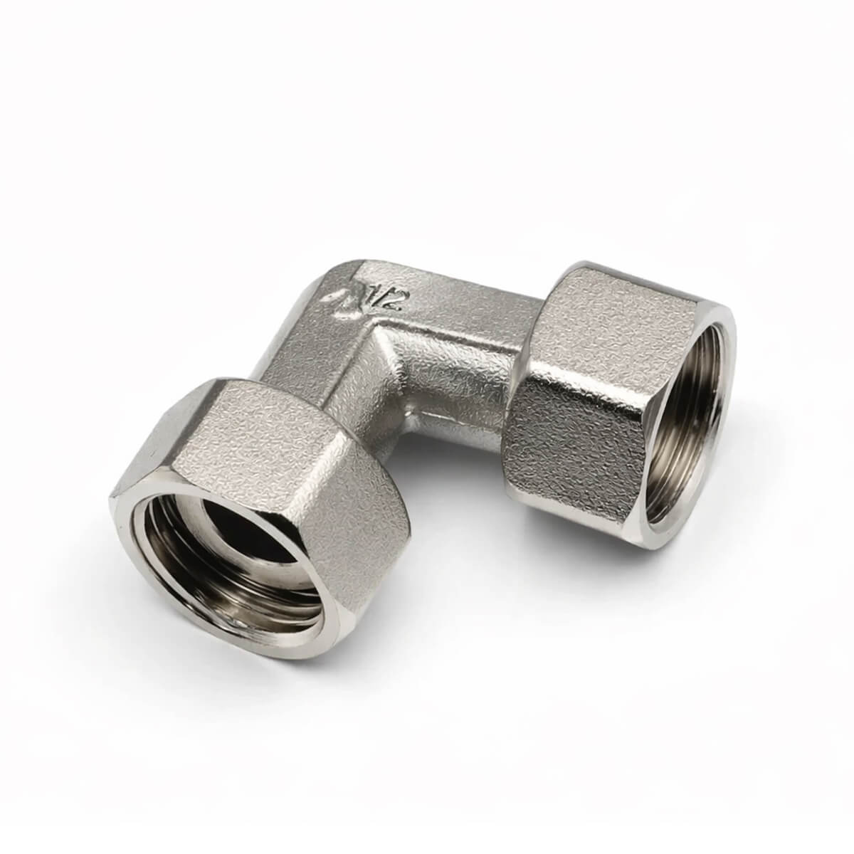 Cot cu piulițe 1/2" filet intern x 1/2" filet intern, din alamă nichelată, 90 de grade, pentru apă și încălzire