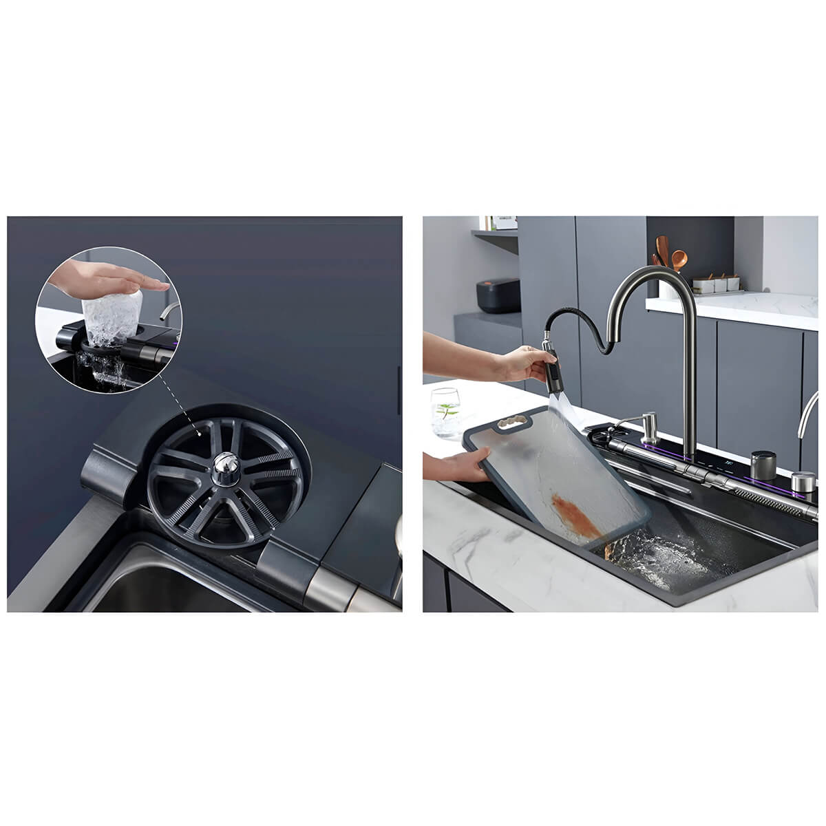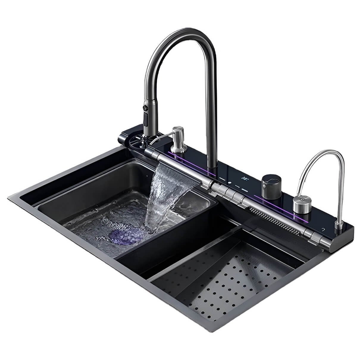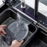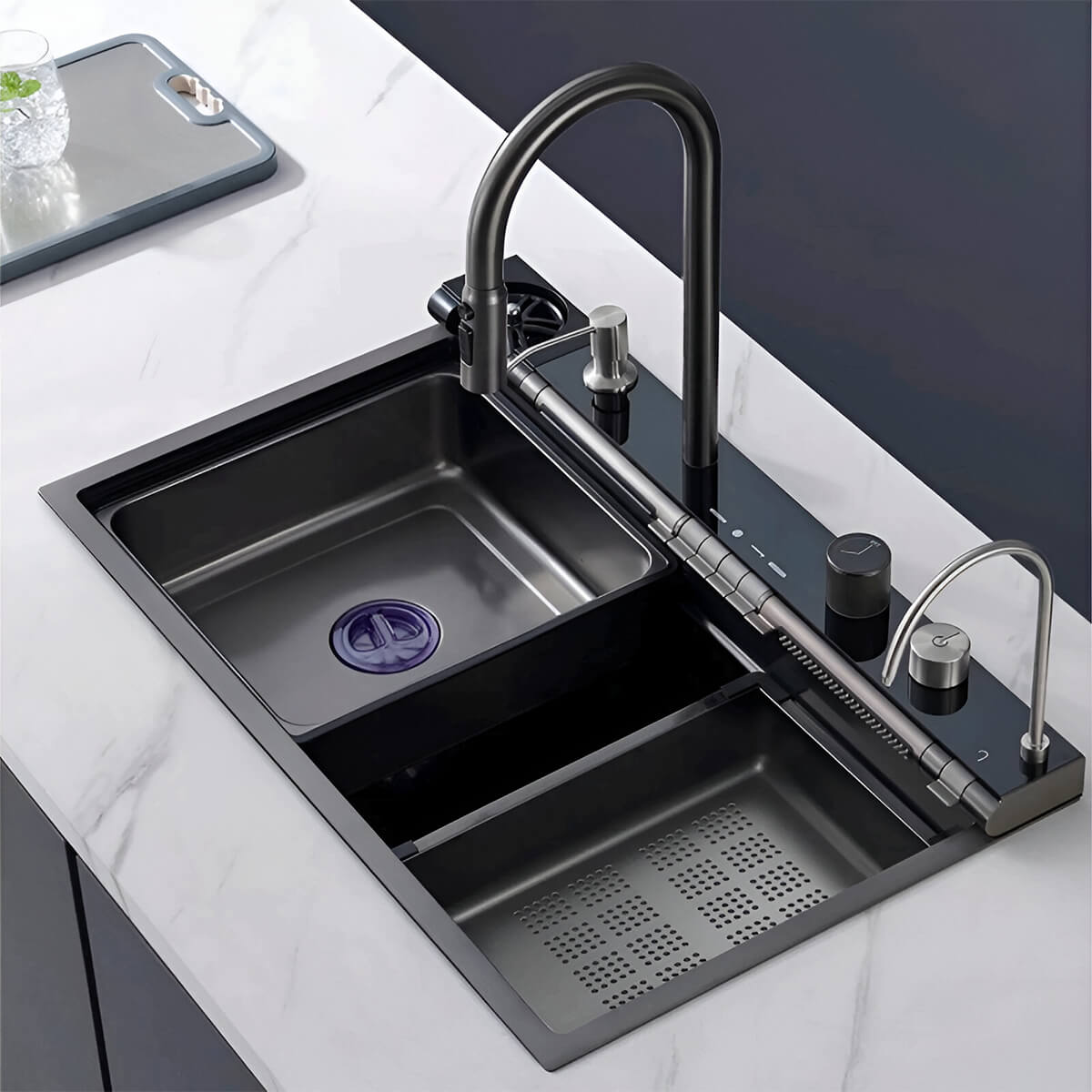 Chiuveta multifuncțională de bucătărie Zerix ZH546-SET-05 Decor Nano-Black, cu baterie integrată din inox reprezintă un modul complet de lucru, care îmbină cuva, bateria termostatică, funcția de cascadă, panoul de control și un set de accesorii integrate pentru optimizarea proceselor de spălare, pregătire și procesare a alimentelor.