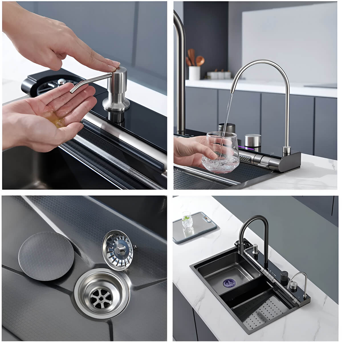 Chiuveta de bucătărie multifuncțională Zerix ZH7546-SET-04 Decor Nano-Black 750×460 mm cu baterie încorporată și efect de cascadă reprezintă un modul complet de lucru pentru spălare, clătire și pregătirea alimentelor, combinând chiuveta, bateria, cascada frontală și un set de accesorii integrate.