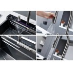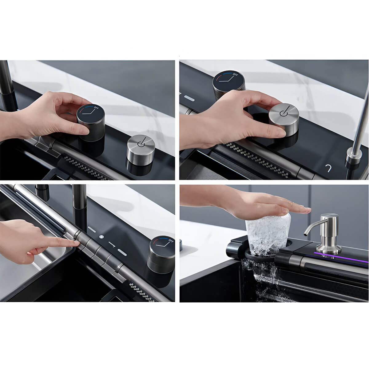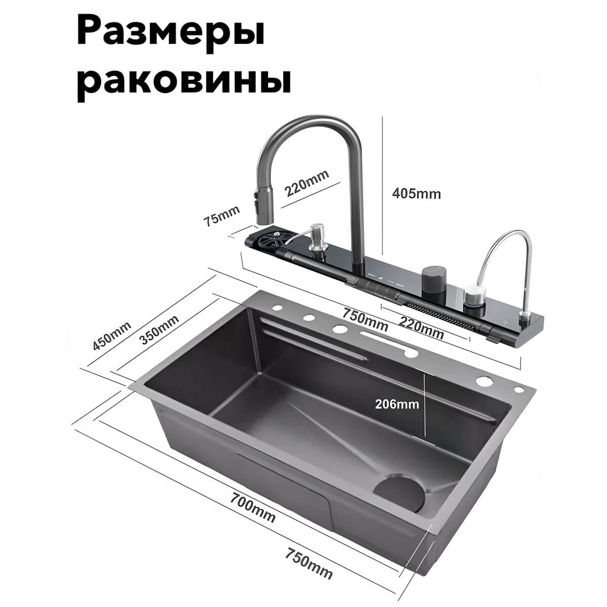 Chiuveta de bucătărie multifuncțională Zerix ZH7546-SET-04 Decor Nano-Black 750×460 mm cu baterie încorporată și efect de cascadă este concepută pentru utilizare zilnică intensivă și permite organizarea unui centru complet de spălare pe un spațiu compact, combinând funcțiile de chiuvetă, baterie, cascadă, clătire pentru pahare și zonă de pregătire a alimentelor.