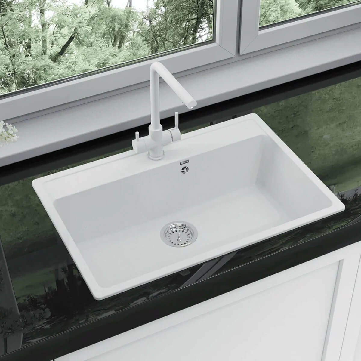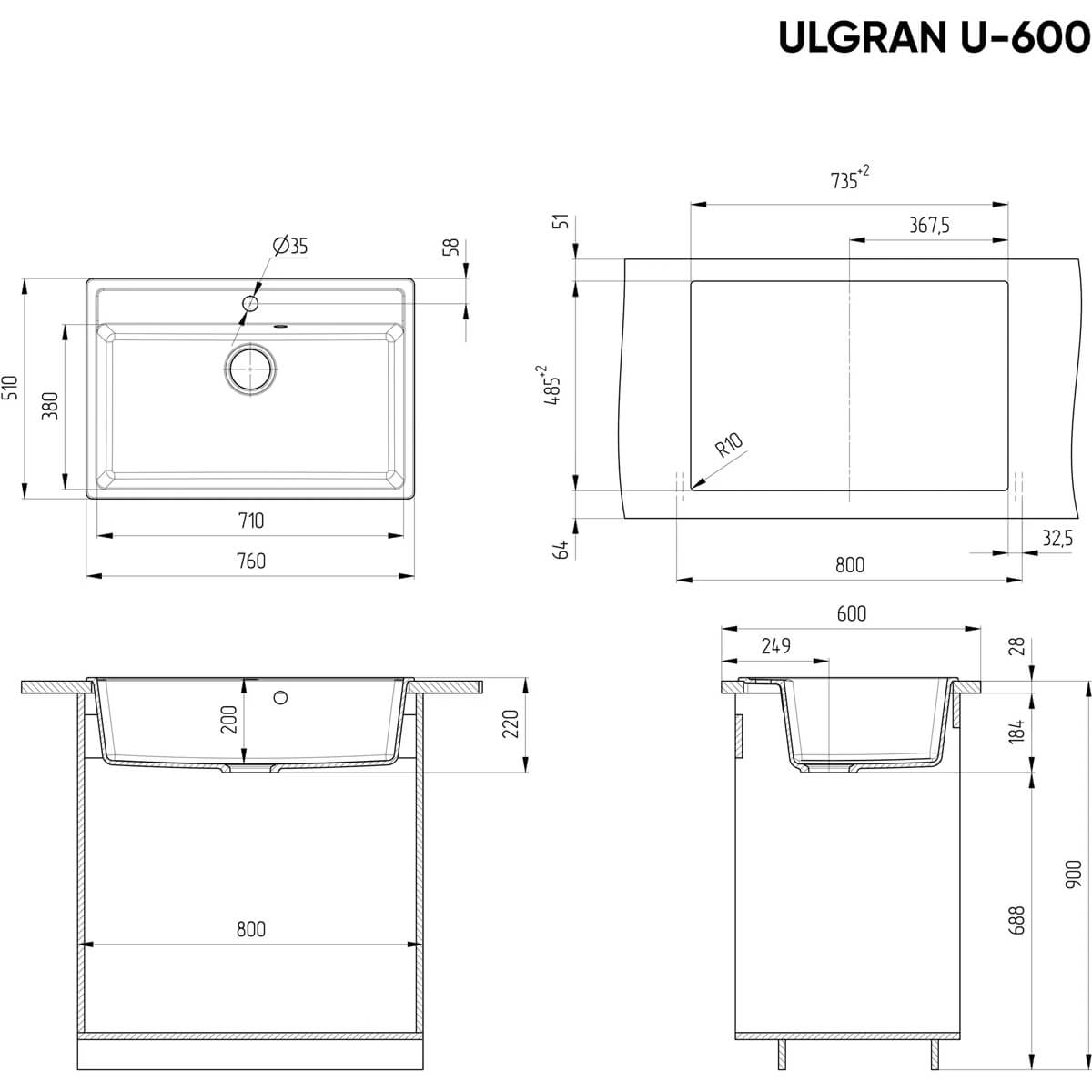 Chiuvetă de bucătărie Ulgran U-600-309, încastrabilă, 760×510×220 mm, marmură artificială, 1 cuvă, gri închis — chiuvetă dreptunghiulară încastrabilă din marmură artificială, cu o cuvă spațioasă și orificiu pregătit pentru baterie. Potrivită pentru cei care caută o soluție „clasică” ordonată, fără elemente inutile, dar cu volum de lucru suficient.