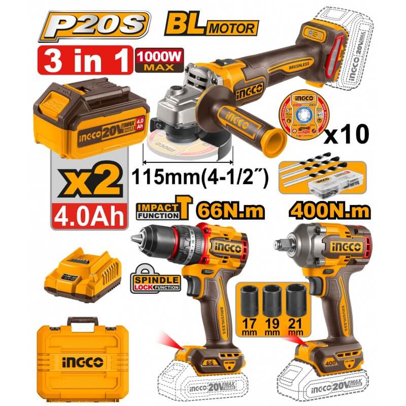 Setul de scule cu acumulator INGCO COSLI241291 20V, mașină de găurit și înșurubat cu percuție, cheie de impact 400 Nm, polizor unghiular 115 mm, 2x4.0 Ah, cu valiză - este o soluție practică pentru atelier, șantier, lucrări de montaj și intervenții mobile. În set sunt incluse o mașină de găurit și înșurubat cu percuție, o cheie de impact și un polizor unghiular de 115 mm, astfel încât un singur kit acoperă mai multe operațiuni: găurire, înșurubare, desfacerea piulițelor și șuruburilor, precum și tăierea și curățarea metalului. Toate sculele funcționează pe aceeași platformă de acumulatori INGCO 20V, ceea ce simplifică lucrul și reduce cantitatea de echipamente suplimentare.