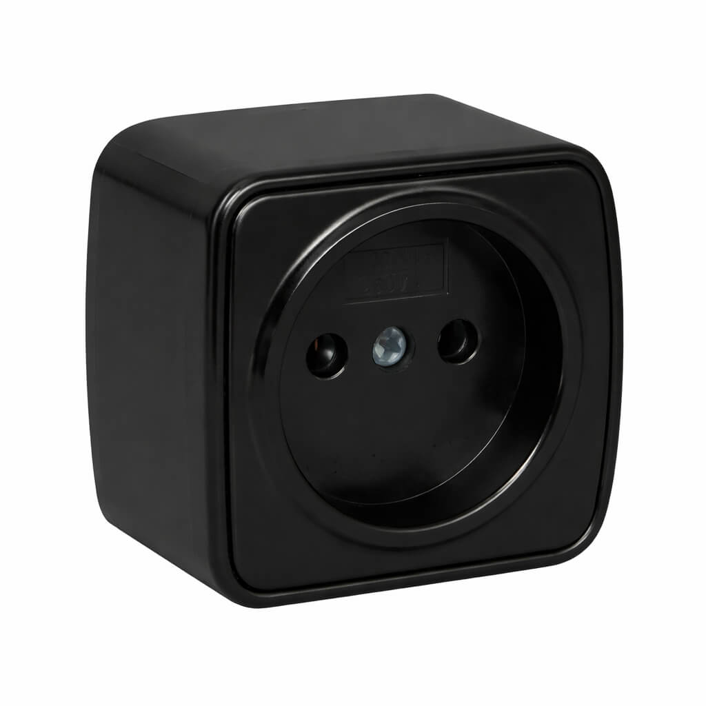 Priză simplă EKF Minsk cu montaj aparent, neagră, 10 A, IP20, 230 V, fără împământare EGR10-022-20 — soluție practică pentru cablaj deschis în spații uscate. Este potrivită pentru conectarea aparatelor electrocasnice în apartament, atelier sau casă de vacanță, atunci când este necesară o priză aparentă compactă fără contact de împământare.