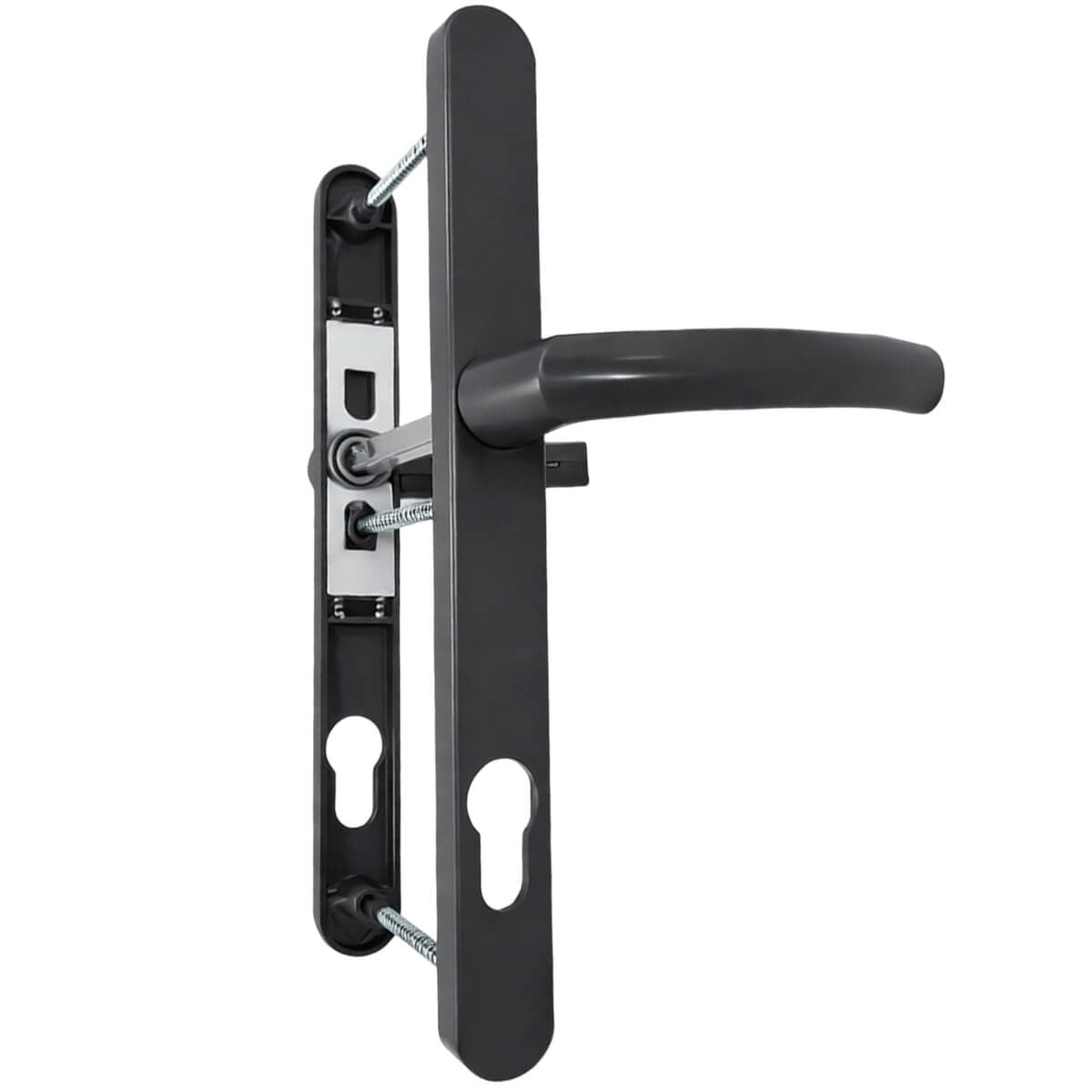 Mânere ușă pe plăcuță îngustă Kale Kilit FLIPPER KEFL85GRU, 25x195 mm, interax 85 mm, grafit, din aluminiu, pentru eurocilindru sunt destinate montajului pe uși profilate înguste (PVC/aluminiu) echipate cu broască pentru eurocilindru. Setul este compatibil atât cu uși stânga, cât și dreapta, asigurând o utilizare comodă și un aspect estetic curat.
