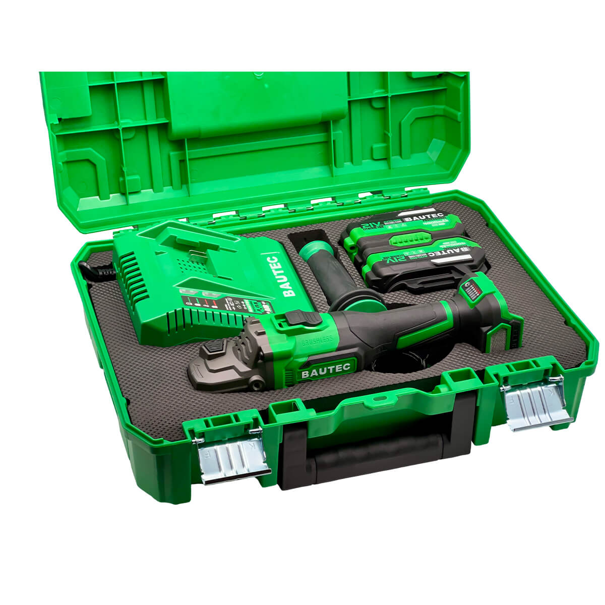 Polizor unghiular cu acumulator BAUTEC JM-125A 21 V, 1200 W, 125 mm, cu motor fără perii, 6 viteze, 2x4Ah, încărcător, valiză — este un instrument compact pentru tăiere, curățare și șlefuire fără dependență de priză. Potrivit pentru atelier, lucrări de montaj pe șantier și intervenții în zone unde utilizarea unui prelungitor este incomodă. Motorul fără perii este conceput pentru putere constantă sub sarcină și necesită mai puțină întreținere în timp.