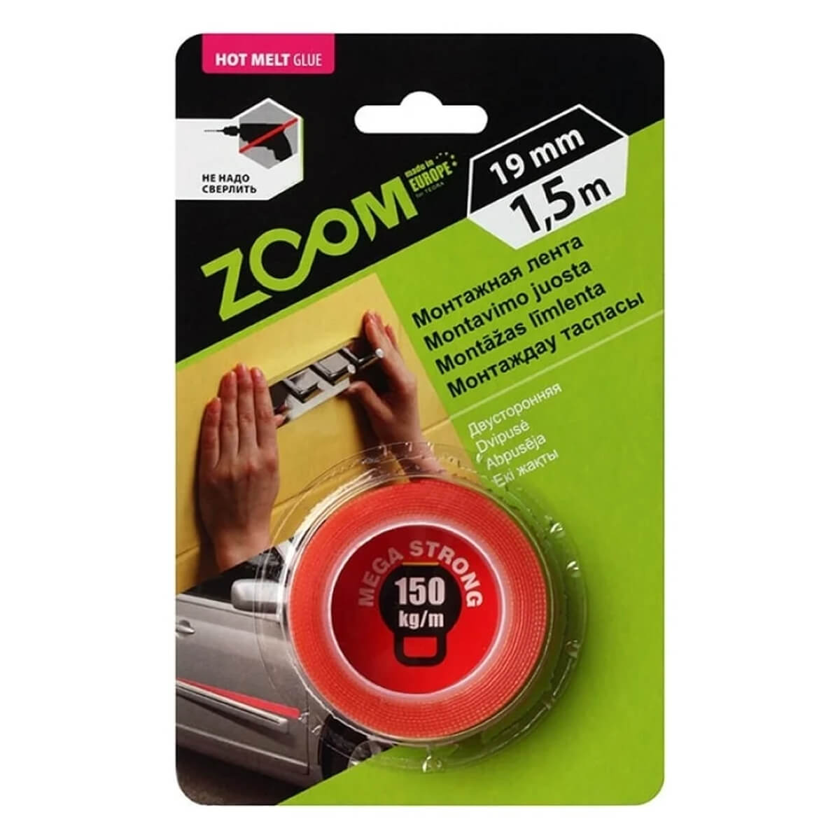 Bandă dublu adezivă de montaj ZOOM Mega Strong 19 mm × 1,5 m, super rezistentă — bandă de montaj cu două fețe pentru fixare rapidă, fără găurire și șuruburi. Este soluția potrivită atunci când trebuie să fixezi obiecte cu precizie, fără a deteriora suprafața. Aderență sigură atât pe suprafețe netede, cât și pe cele ușor neregulate, iar montajul durează doar câteva minute.
