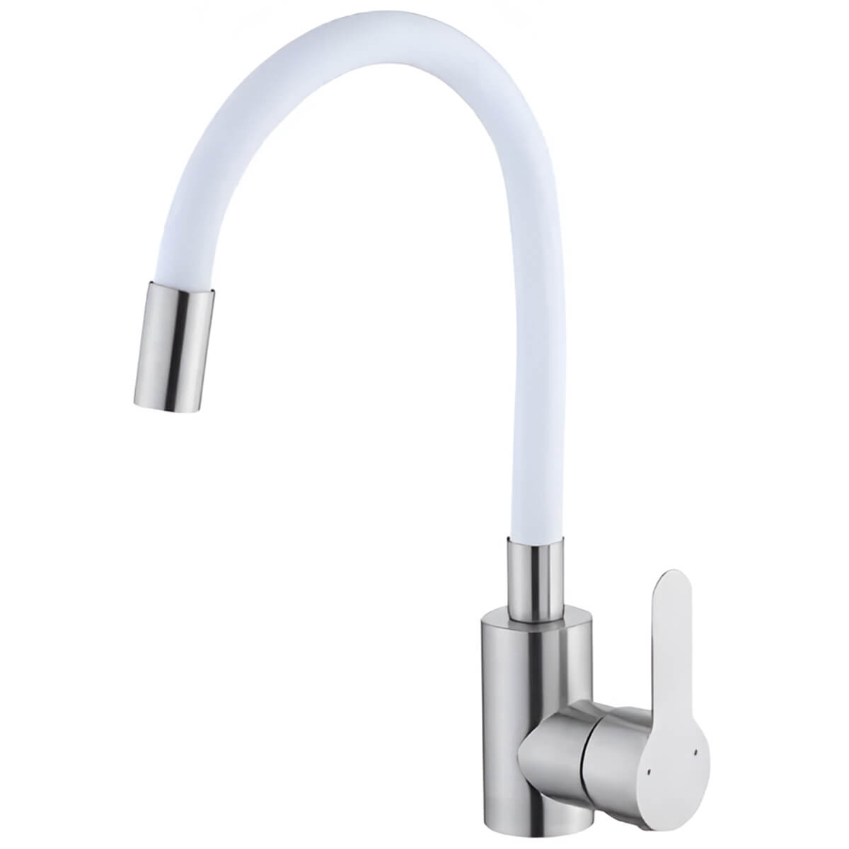 Bateria de bucătărie AquaFix 404 albă, cu pipă flexibilă, din inox, monocomandă este o soluție practică pentru o chiuvetă modernă. Modelul combină un aspect îngrijit, un corp compact și o pipă înaltă, comodă pentru spălarea zilnică a vaselor, legumelor și ustensilelor de bucătărie.
