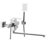 Bateria este destinată montajului pe perete și se conectează la două conducte de alimentare cu apă. Pipa de 350 mm se rotește liber, oferind comoditate atât la umplerea căzii, cât și la utilizarea lângă chiuvetă pentru diverse sarcini casnice. Pe corp este amplasat un divertor pentru comutarea rapidă între modul duș și pipa de scurgere. Operarea este simplă și intuitivă.
