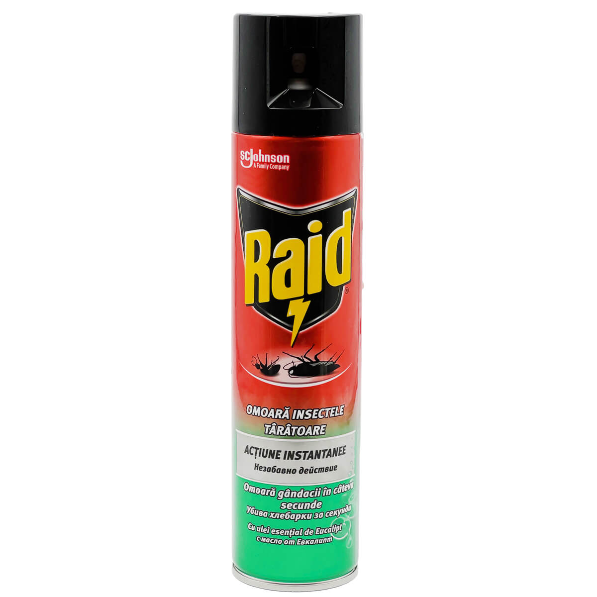 Spray împotriva gândacilor și furnicilor RAID eucalipt, 400 ml — un produs universal pentru combaterea insectelor târâtoare din spațiile de locuit și cele anexe. Formula eficientă acționează rapid asupra gândacilor și furnicilor și ajută, de asemenea, la eliminarea altor insecte nedorite. Aroma de eucalipt face procesul de utilizare mai plăcut.