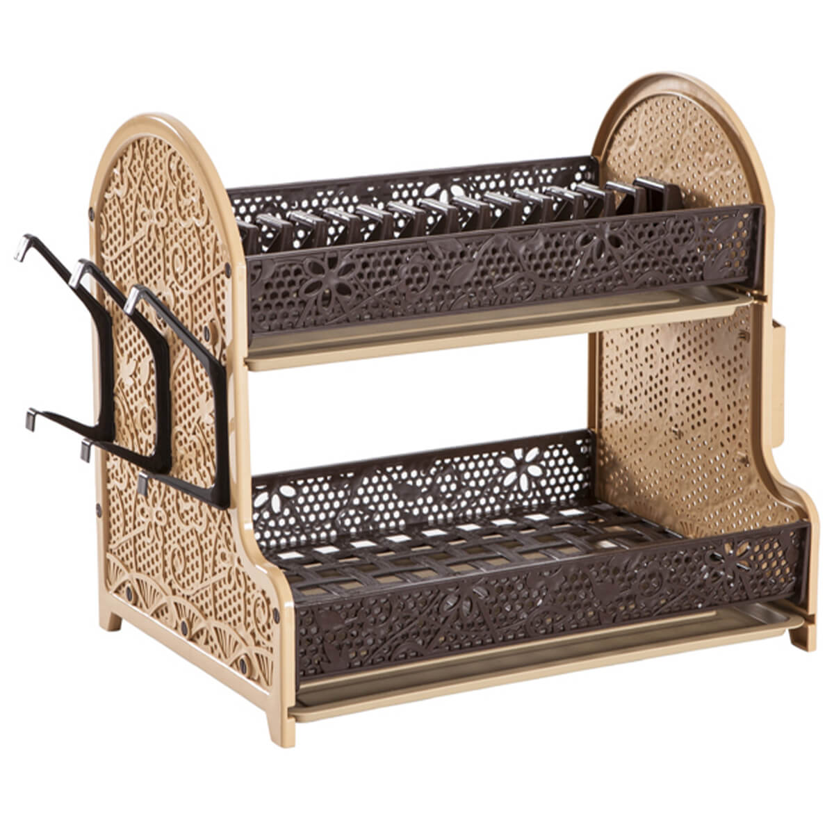 Uscător de vase cu 2 nivele Violet House Ajur 0414, din plastic, cu tavă, 28×40×38 cm — soluție compactă pentru uscarea farfuriilor, ceștilor/paharelor și tacâmurilor pe blatul de bucătărie. Cele două niveluri permit aranjarea unei cantități mai mari de veselă, iar tava colectează picăturile și menține suprafața de lucru uscată.